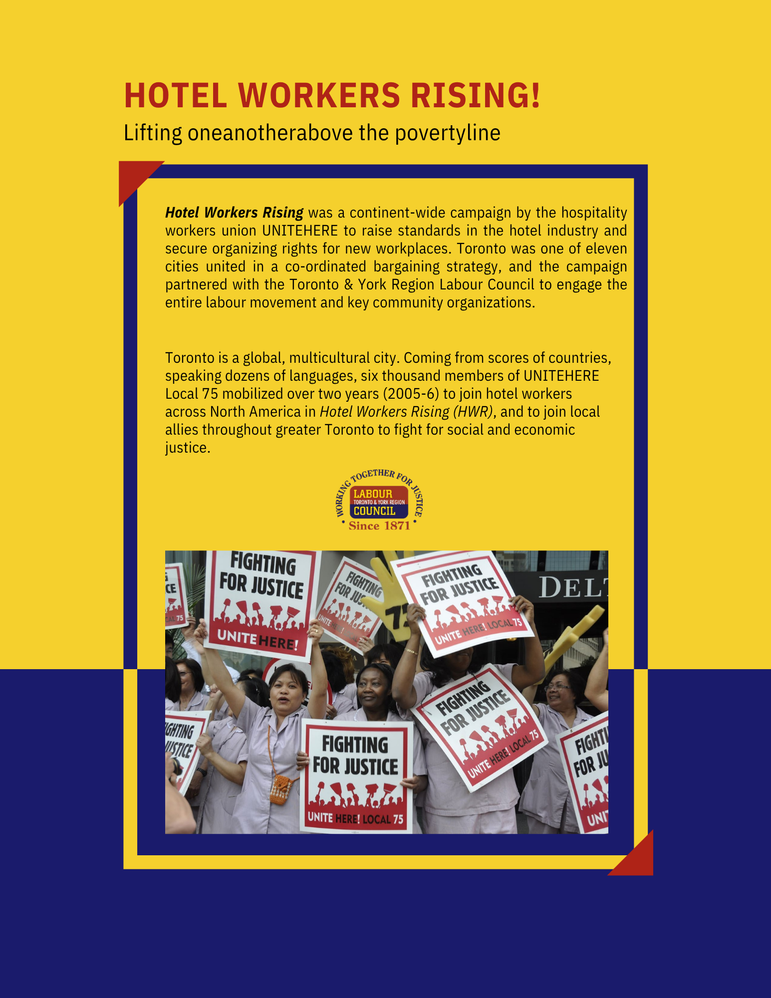 Hotel Workers Rising was a continent-wide campaign by the hospitality workers union UNITEHERE to raise standards in the hotel industry and secure organizing rights for new workplaces. Toronto was one