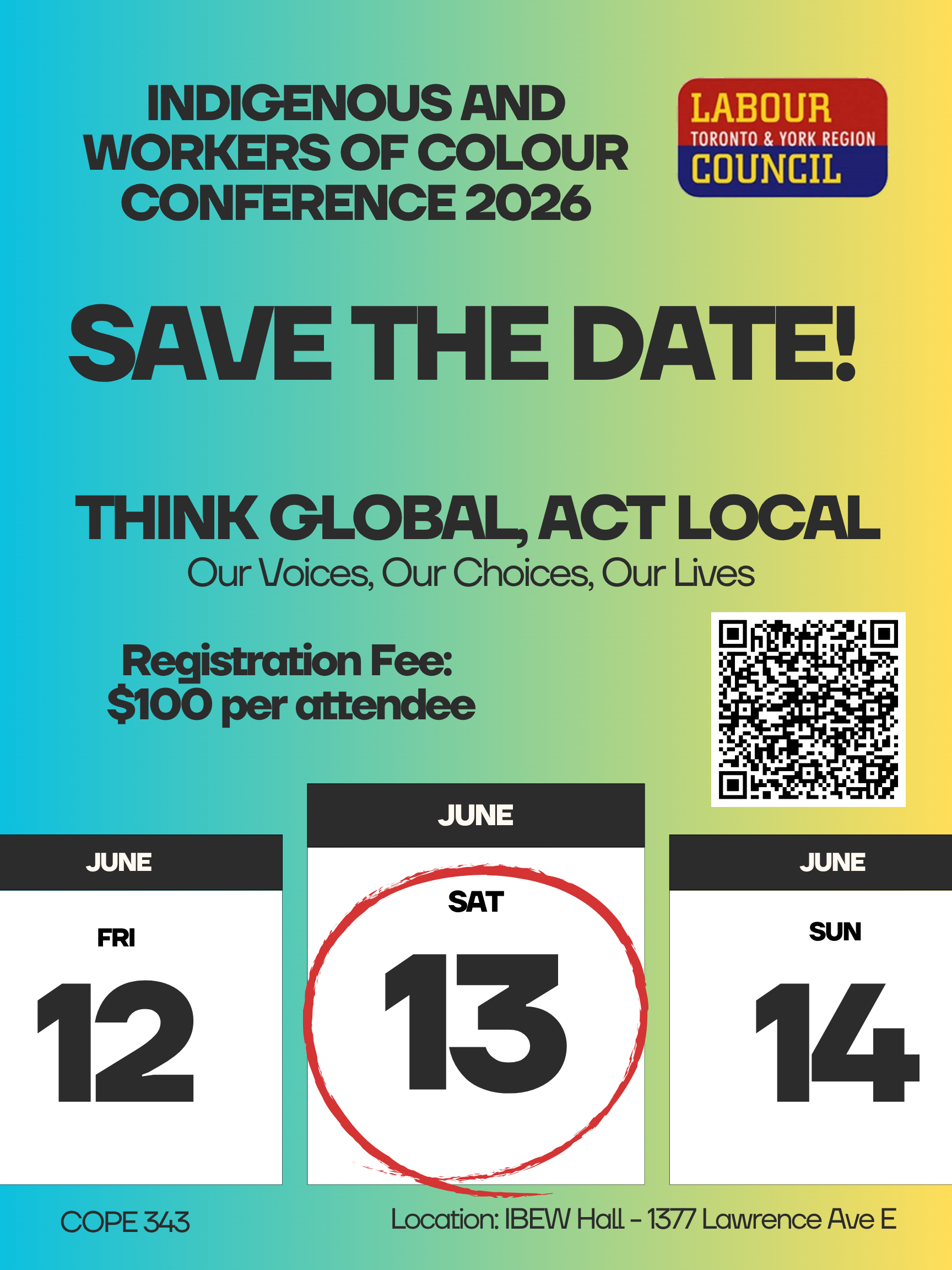 Update Save The Date: Indigenous and Workers of Colour Conference 2026 The 2026 IWOC Theme will be: THINK GLOBAL; ACT LOCAL: OUR VOICES, OUR CHOICES, OUR LIVES Geordie Dent April 20, 2026